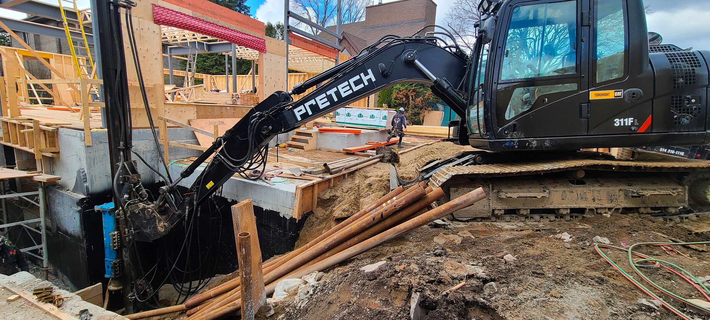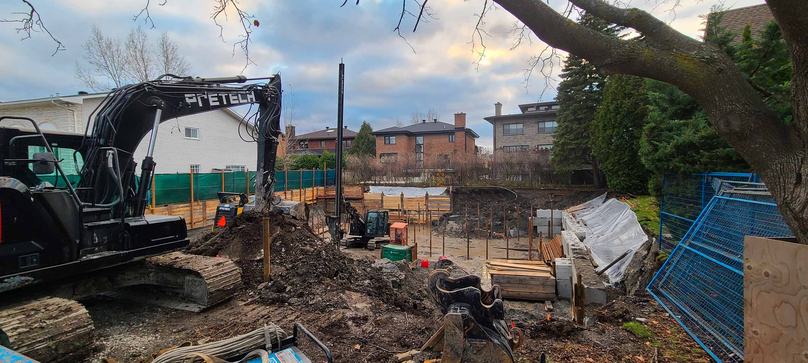 Ce projet représentait tout un défi avec la proximité des bâtiments et le sol limoneux instable. Mur berlinois et pieutage de la fondation ont été nécessaires. Encore une fois, les pieux battus offrent une stabilité incomparable pour la fondation de cette magnifique maison.